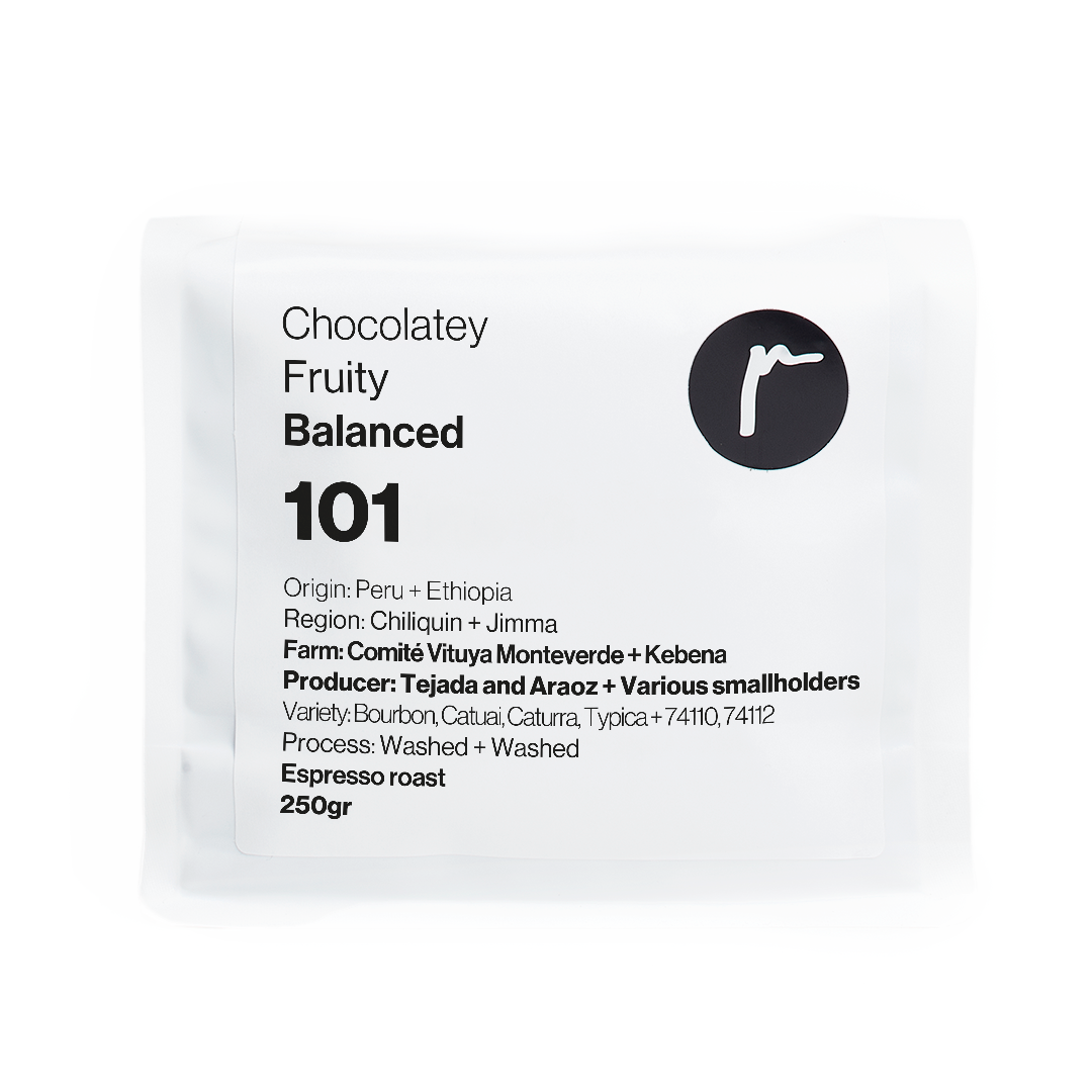 Our 101 blend is our most balanced espresso option. Full bodied, chocolatey and a little fruity with a wide sweet spot that’s great on its own and shines with milk.