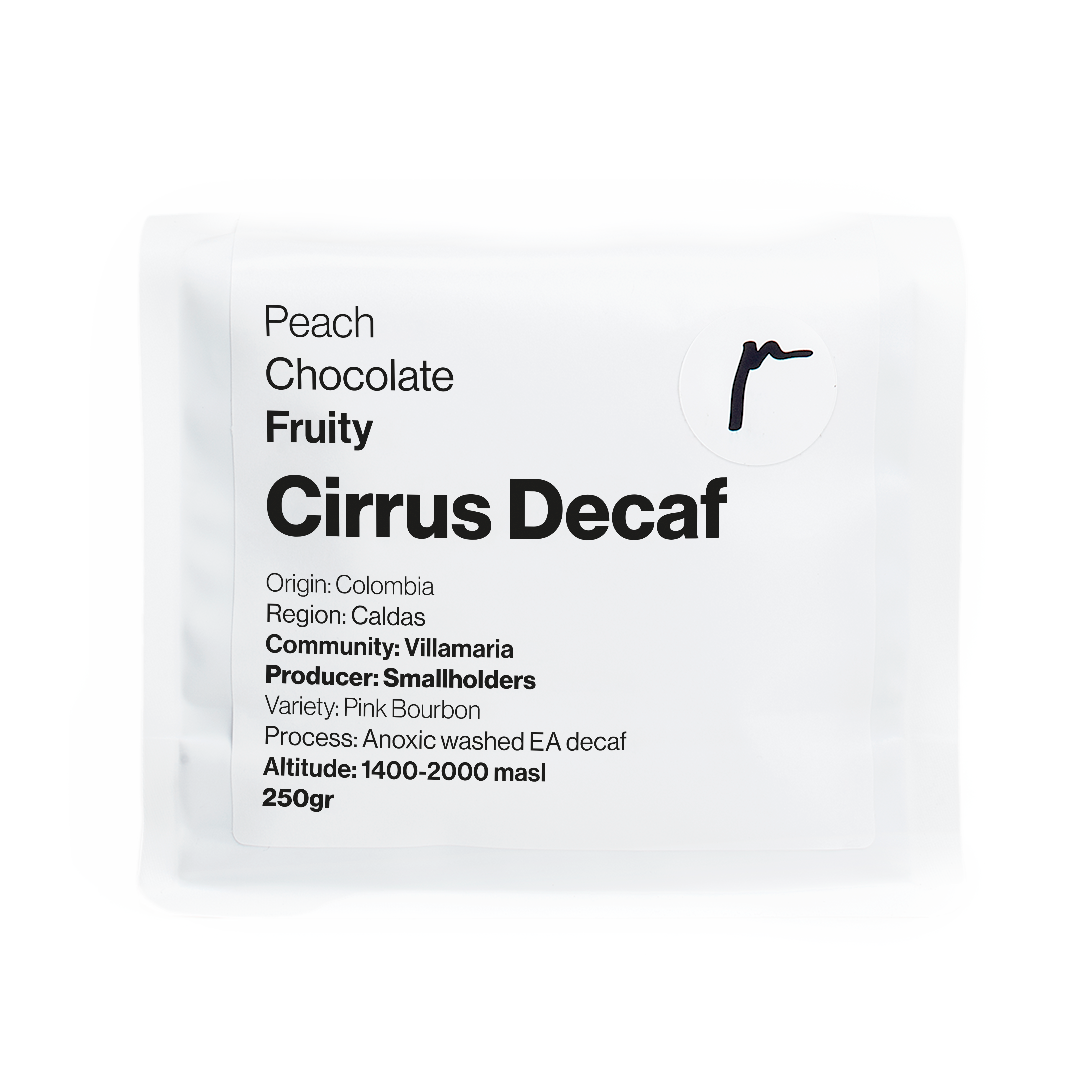 Cirrus is the second of 2 pink bourbon EA decafs that we release, both from Villamaria in Colombia, imported by Raw Material. The Pink Bourbon cherries travel down the mountain to Jamaica, where the RM Colombia team constructed a drying facility. The station sits several hundred metres downhill from the producers, making good use of the higher temperatures closer to sea level, which ensure a consistent drying environment for coffee.